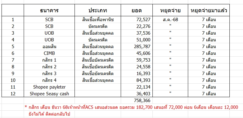 รบกวนช่วยวางแผน หยุดจ่าย 7 เดือน กำลังจะจัดการหนี้รวม 7.5 แสนครับ มี รายการตามนี้ครับ
